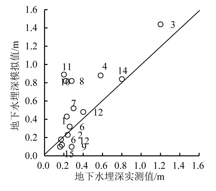 为验证DHSVM模型模拟结果的空间变化精确性,于2015年4月24日在监利县程集镇随机选取15个农田观测点,挖坑静置2h后观测地下水埋深。地下水埋深实测值与DHSVM模型地下水埋深模拟值的对比如图2所示。尽管地下水埋深观测不规范,观测结果值不是很准确,但地下水埋深与DHSVM模型地下水埋深模拟值具有明显的相关性(图2,数据点旁边的数字代表观测点号),复相关系数为0.56,样本为15,说明DHSVM模型能准确模拟地下水位埋深的空间分布。