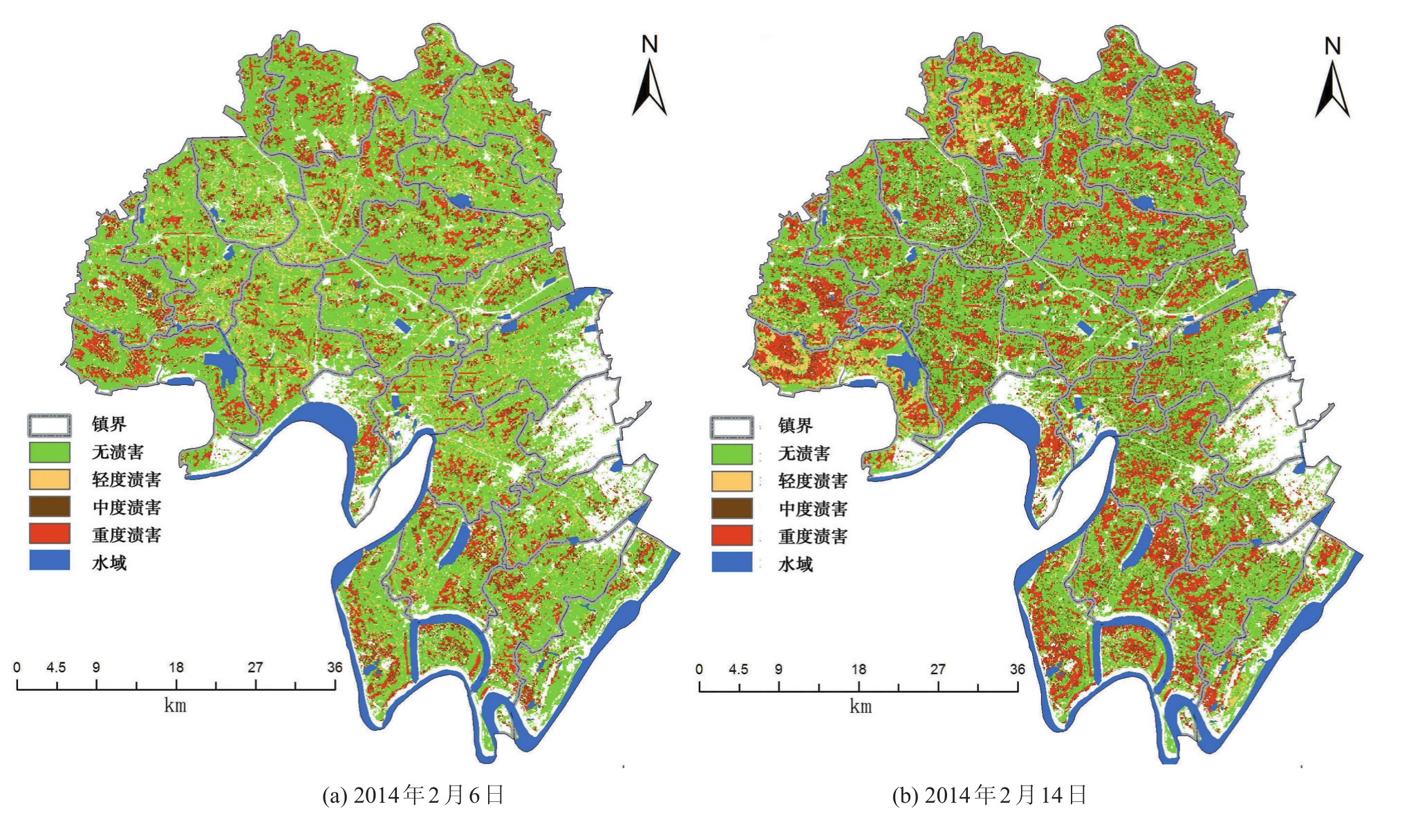 图4 2014年2月14日至4月8日监利县渍害空间变化