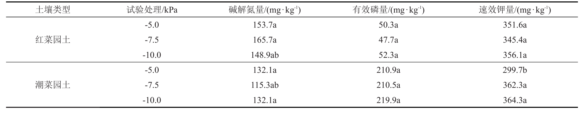 由表5可知,红菜园土以-7.5 kPa处理碱解氮量最高,为165.7 mg/kg,以-10.0 kPa处理土壤有效磷量和速效钾量最高,各处理间差异不显著。潮菜园土以-10.0 kPa处理土壤速效养分最高,各处理间碱解氮量和有效磷量未达差异显著水平,速效钾量与-5.0 kPa处理差异显著。2种供试土壤通过施肥和种植小白菜,速效养分均有所提高,其中红菜园土高于潮菜园土。红菜园土碱解氮量、有效磷量、速效钾量分别较试验前提高55.8%、231%、224%,潮菜园土则分别提高10.0%、7.6%、247%。由于2种供试土壤的供钾水平均较低,故施肥可提高土壤的供钾能力,潮菜园土为磷富集土壤,有效磷高达197.8 mg/kg,施用少量磷肥,有效磷提升幅度较小,红菜园土为缺磷土壤,施用少量磷肥,土壤有效磷提升231%。