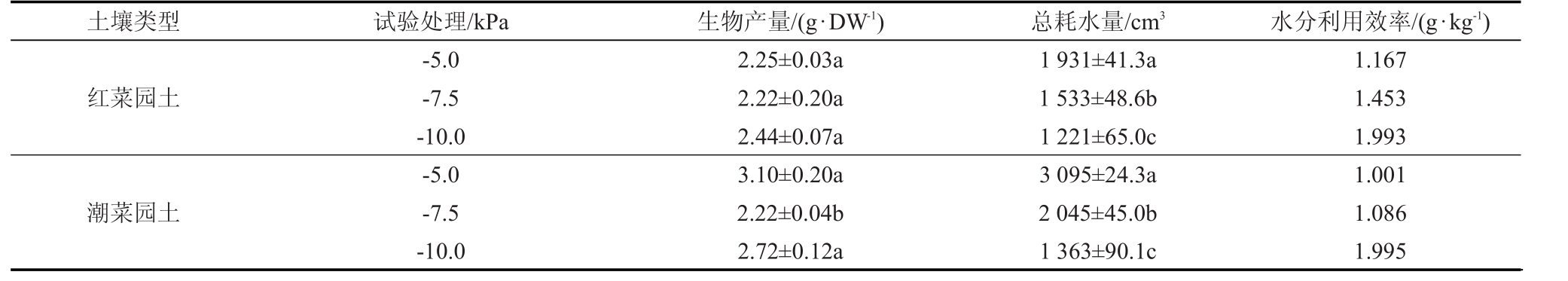 表3 不同负压给水处理小白菜生物量及水分利用效率