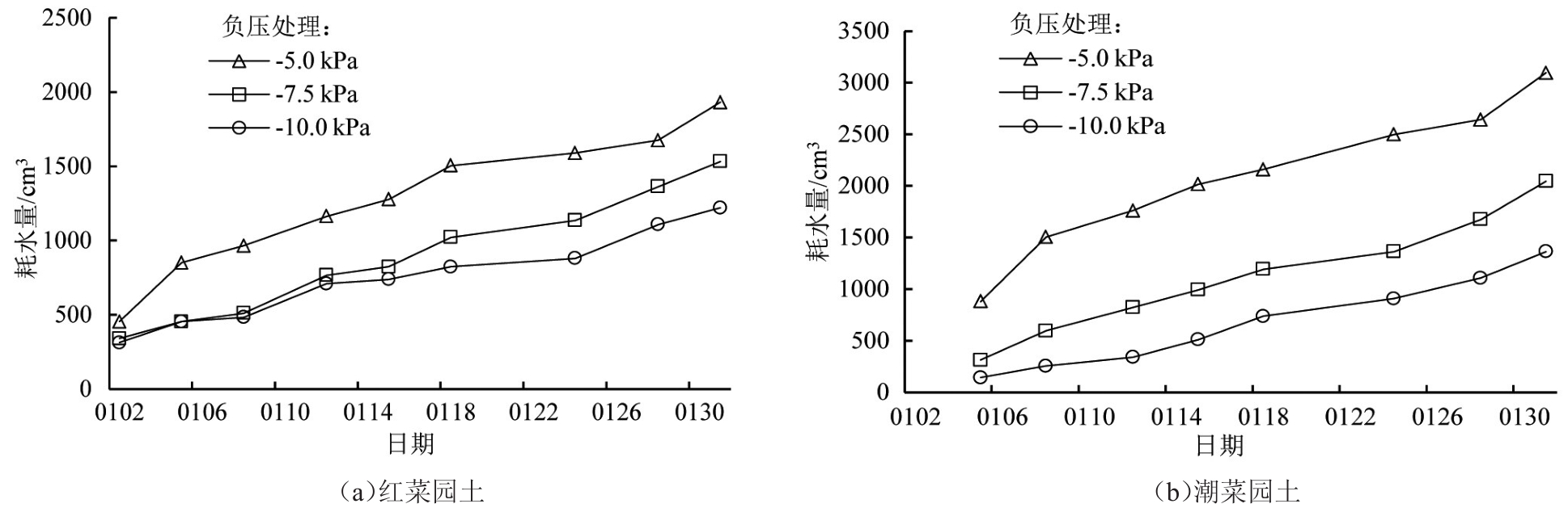 2)相同负压给水,潮菜园土含水率高于红菜园土。从土壤质地和田间持水率分析,潮菜园土为粉砂质黏壤土,田间持水率29.5%,红菜园土为粉砂质黏土,田间持水率26.2%;从土壤肥力状况分析,潮菜园土所含有机质量高于红菜园土,具有更好的土壤结构、孔隙状况以及持水性能。
