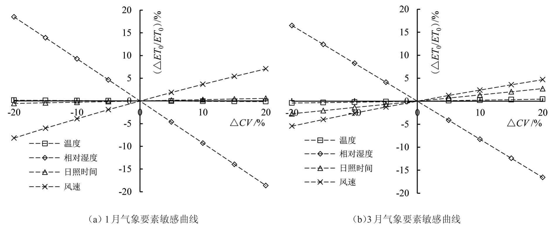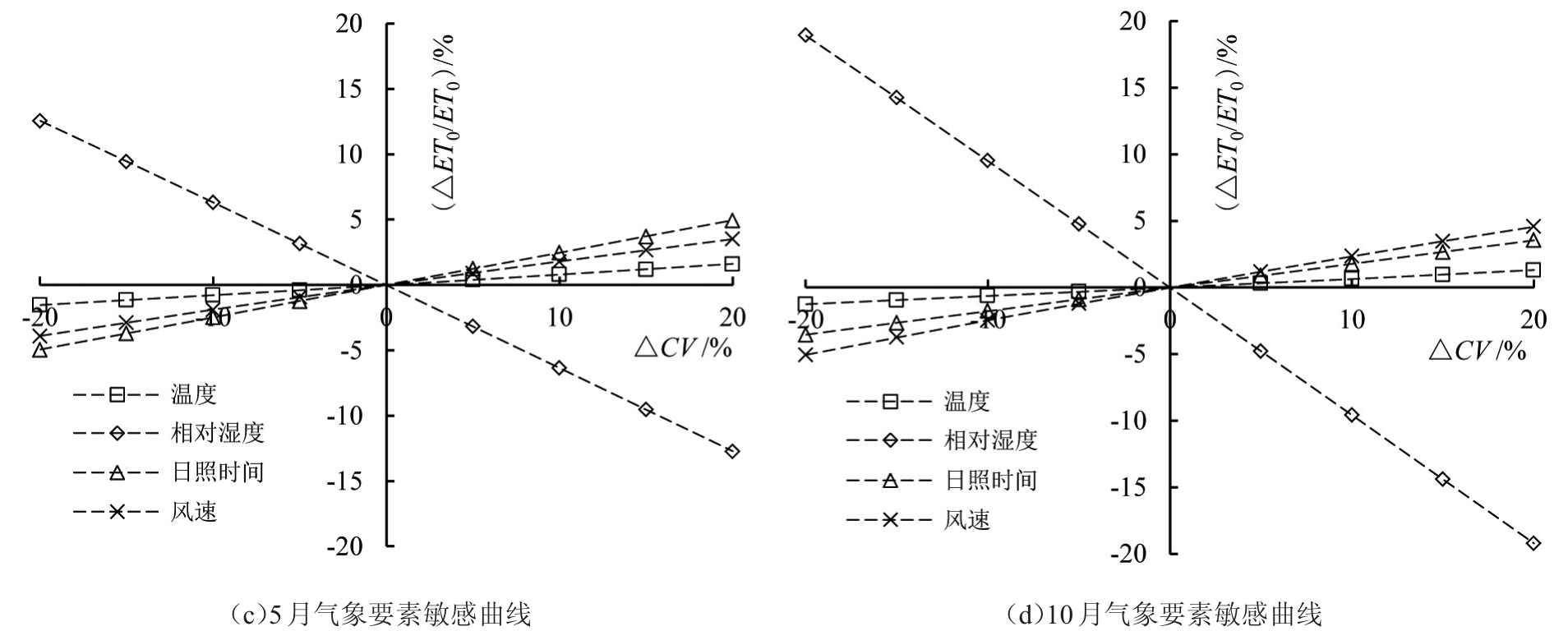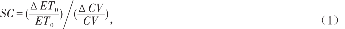 式中:SC为敏感系数;ET0为参考作物蒸散量原值;△ET0为参考作物蒸散量变化值;CV为气象要素原值;△CV为气象要素变化值。