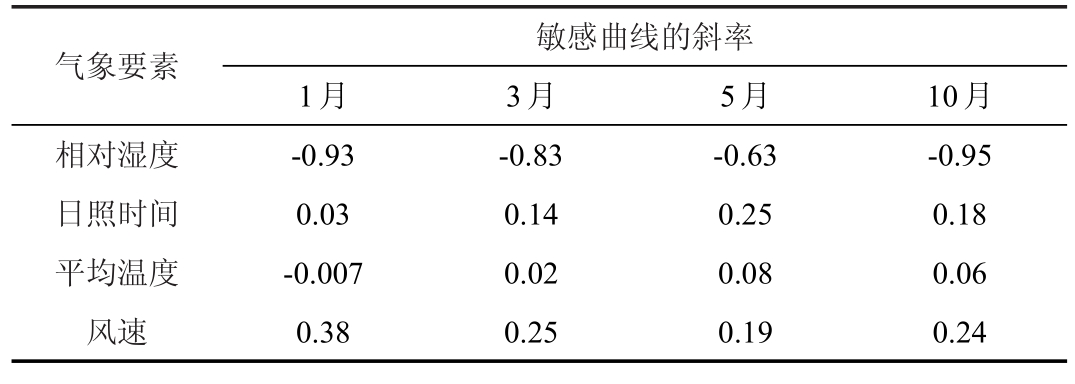 表3为敏感曲线的斜率及相关系数。由表3可以看出,气象要素对ET0的影响是随时间变化的,在典型时段内,相对湿度敏感曲线斜率的绝对值要大于其余3个气象要素,表明相对湿度对ET0的影响最大,其在3、5月的敏感曲线斜率的绝对值小于1、10月;平均温度的敏感曲线斜率在典型时段中,要小于其余3个气象因子,说明温度变化对ET0的影响最小,且在温度较低的1、3月,其敏感曲线斜率要小于温度较高的5、10月,说明温度对ET0的影响程度随着温度的升高而增大;在日照时间较长的5月中,日照时间对于ET0的敏感性要大于风速,在日照时间较短的1、3、10月中,日照时间对于ET0的敏感性小于风速,且随着日照时间的增加,日照时间对于ET0的敏感性有所增加。