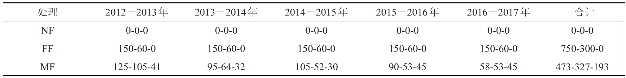 试验始于2012年,于2017年结束,设置传统农户施肥处理(FF)、优化监控施肥处理(MF)和连作不施肥处理(NF),其中FF处理施肥量为当地农户习惯施肥,具体为N:150 kg/hm2,P2O5:60 kg/hm2;MF处理施肥采用“0~100 cm土壤硝态氮监控施肥,0~40 cm土层磷钾恒量施肥”技术,其中施氮量(以纯N计)=作物目标产量需氮量-播前0~100 cm土壤硝态氮累积量+播前0~100 cm土壤硝态氮安全阈值(110.0kg/hm2);施磷(钾)量=作物目标产量需磷(钾)量×施磷(钾)系数;施磷(钾)系数依据0~40 cm土层速效磷钾量确定[16-17]。NF处理不施任何肥料。每个处理重复4次,采用随机区组排列,由于地块大小原因,小区面积为210~520 m2。具体施肥量见表1。