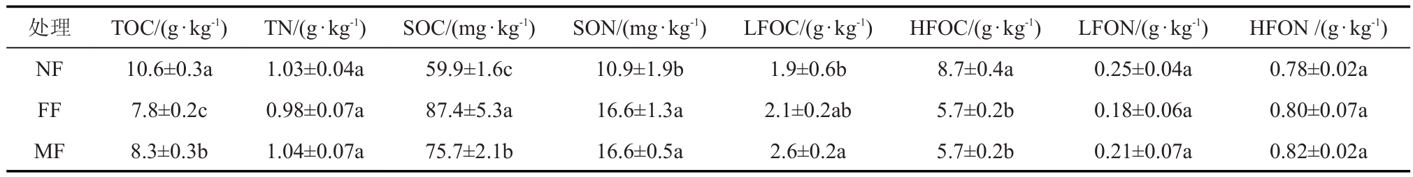 处理NF FF MF HFON/(g·kg-1)0.78±0.02a 0.80±0.07a 0.82±0.02a TOC/(g·kg-1)10.6±0.3a 7.8±0.2c 8.3±0.3b TN/(g·kg-1)1.03±0.04a 0.98±0.07a 1.04±0.07a SOC/(mg·kg-1)59.9±1.6c 87.4±5.3a 75.7±2.1b SON/(mg·kg-1)10.9±1.9b 16.6±1.3a 16.6±0.5a LFOC/(g·kg-1)1.9±0.6b 2.1±0.2ab 2.6±0.2a HFOC/(g·kg-1)8.7±0.4a 5.7±0.2b 5.7±0.2b LFON/(g·kg-1)0.25±0.04a 0.18±0.06a 0.21±0.07a