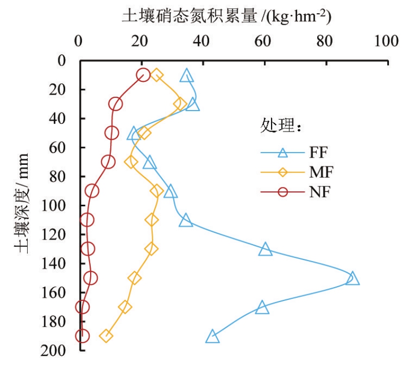 土壤硝态氮累积量(kg/hm2)=土层厚度(cm)×土壤体积质量(g/cm3)×土壤硝态氮质量分数(mg/kg)/10。
